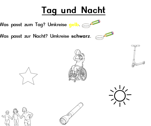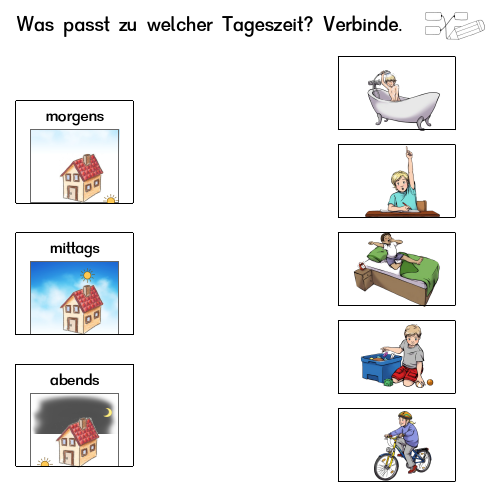 Für eine Differenzierung lässt sich der Begriff „mittags“ in vor- und nachmittags erweitern. Enthalten sind Arbeitsblätter sowie anschauliche Bildkarten.