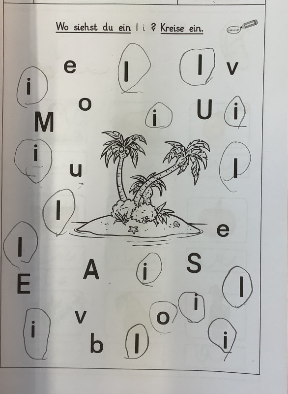 Wo siehst du ein I i? Die Kinder umrkeisten alle I auf dem AB. Das AB ist ein Selbstläufer und selbst sehr schwache Kinder – ich habe beispielsweise zwei an der Grenze zu gE – haben hier ein wenig Entlastung und ein Erfolgserlebnis.