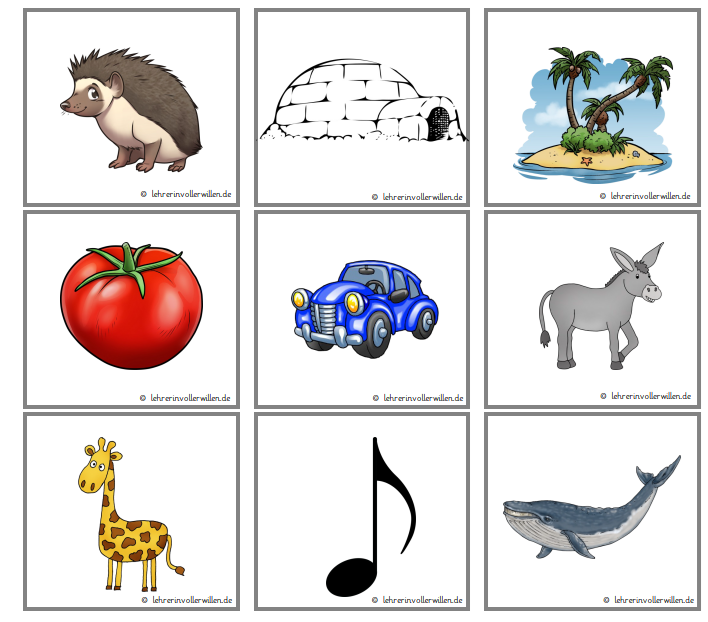 In der Vorstunde habe ich das I mit einem Igel eingeführt. Die Kinder haben zudem Bildkarten bekommen, die Silben geschwungen, ich habe das Wort dazu aufgeschrieben und sie haben das i markiert. So wurde die auditive und visuelle Wahrnehmung schon einmal vorentlastet. Die Bildkarten kannst du dir hier herunterladen.