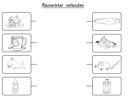 - für fittere Kinder eignen sich zum Fordern ABs, bei denen links auf dem AB sieben und rechts sieben Reimbilder abgebildet sind, die miteinander verbunden werden müssen. Dazu müssen sie immer alle Reimbilder laut aussprechen. Für schwächere SuS eignen sich drei Bilder und das Reimpaar muss gefunden werden.