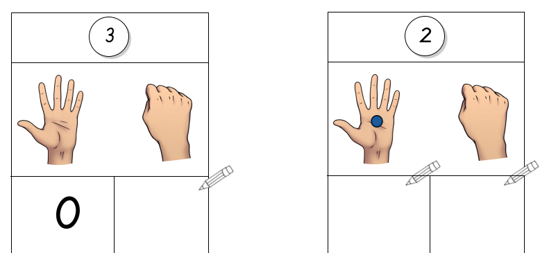 Danach sind wir in eine Partnerarbeit gegangen: Jede Partnergruppe hat 3 Muggelsteine bekommen. Ein Kind verteilt hinter dem Rücken die drei Steine auf die zwei Hände auf. Das Partnerkind tippt auf eine Hand und das Kind zeigt die Hand offen. Anhand der Anzahl an Steinen, die in der geöffneten Hand liegen, benennt das Partnerkind die Anzahl an Steinen in der geschlossenen Hand.